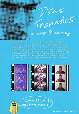 El sábado 11 de septiembre David Domingo organiza una multiproyección en los Cines Luna de Madrid, coincidiendo con la celebración de La Noche en Blanco. La apropiación del inicio de la película Días de Trueno (1990), protagonizada por Tom Cruise, dará paso a una cúmulo de impresiones audiovisuales situadas entre el Expanded Cinema y el found footage de ficción en formato subestándard. Una buena ocasión para dejarse llevar por la magia del cine en directo de este cineasta excepcional.