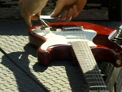 Guitar Drag (2000) de Christian Marclay es una de las obras audiovisuales que mejor captura el fenómeno del ruido en el ámbito videoartístico. A lo largo de catorce minutos, este reconocido artista sonoro documenta una acción que consiste en arrastar una guitarra eléctrica atada, por una cuerda, a un camión en movimiento. El sonido amplificado de la Fender Stratocaster emite zumbidos disonantes y frecuencias estruendosas a medida que las cuerdas y la madera del objeto se van deteriorando, progresivamente, por el violento contacto con el asfalto. Lastimando la herramienta principal del mundo del Rock, Marclay invoca tanto el espíritu Fluxus representado en los destrozos practicados a pianos de cola, como las actuaciones incendiarias de Jimi Hendrix. Producir sonidos aleatorios mediante la destrucción de instrumentos musicales, es una práctica sonora improvisada que Philip Corner ya reclama a principios de los años sesenta, en defensa de la indeterminación, ante los desarrollos previsibles del serialismo integral de Anton Webern.