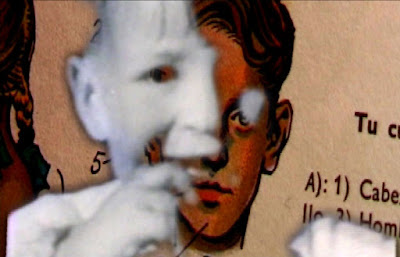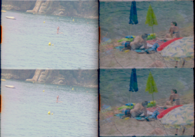“Slides se creó mientras estudiaba en Sant Martin’s. Como la pieza de la máquina de coser, fue una película que sucedió. Por aquél entonces estaba inmersa en el film y siempre tenía trozos de película alrededor de mi habitación, en la mesa, por todos los sitios, siempre fragmentos breves. Tenía diapositivas de mis pinturas y las recorté para convertirlas en una tira de película. Imagina un fragmento de celuloide de 16 mm con perforaciones. En lugar de eso lo que tenía era una tira –ligeramente más estrecha– sin las perforaciones y las diapositivas fueron cortadas a trozos, tan solo pequeños fragmentos, pegados con otra película, y también cosidos (la pieza es anterior a Reel Time). Hay trozos cosidos con hilo y algunos otros con agujeros perforados. Para mi fue un modo muy natural de proceder, ya que vengo de la pintura, por el hecho de que trabajar con algo que podía sostener con las manos era algo menos amenazador que trabajar con aparatos fílmicos”.